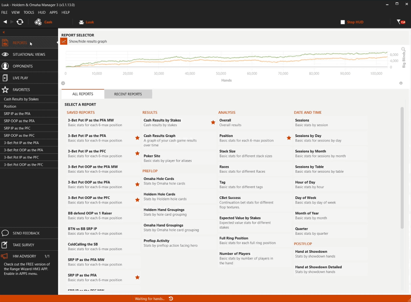 Don’t forget my recommendation for the basic reports and basic filtering options that are available in HM3, and make sure to download the 18 preflop categories to study and dive deeper into your pre-flop game, as well as the 8 custom reports to quickly jump into specific situations.