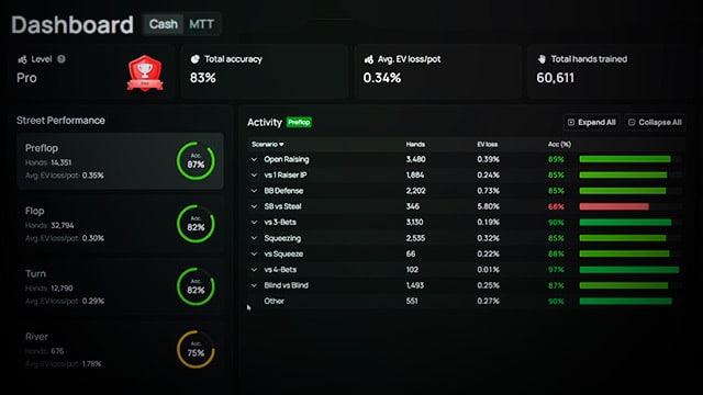 Train against 1M+ GTO solutions with instant EV Difference feedback. Know which mistakes cost you the most and fix them first.